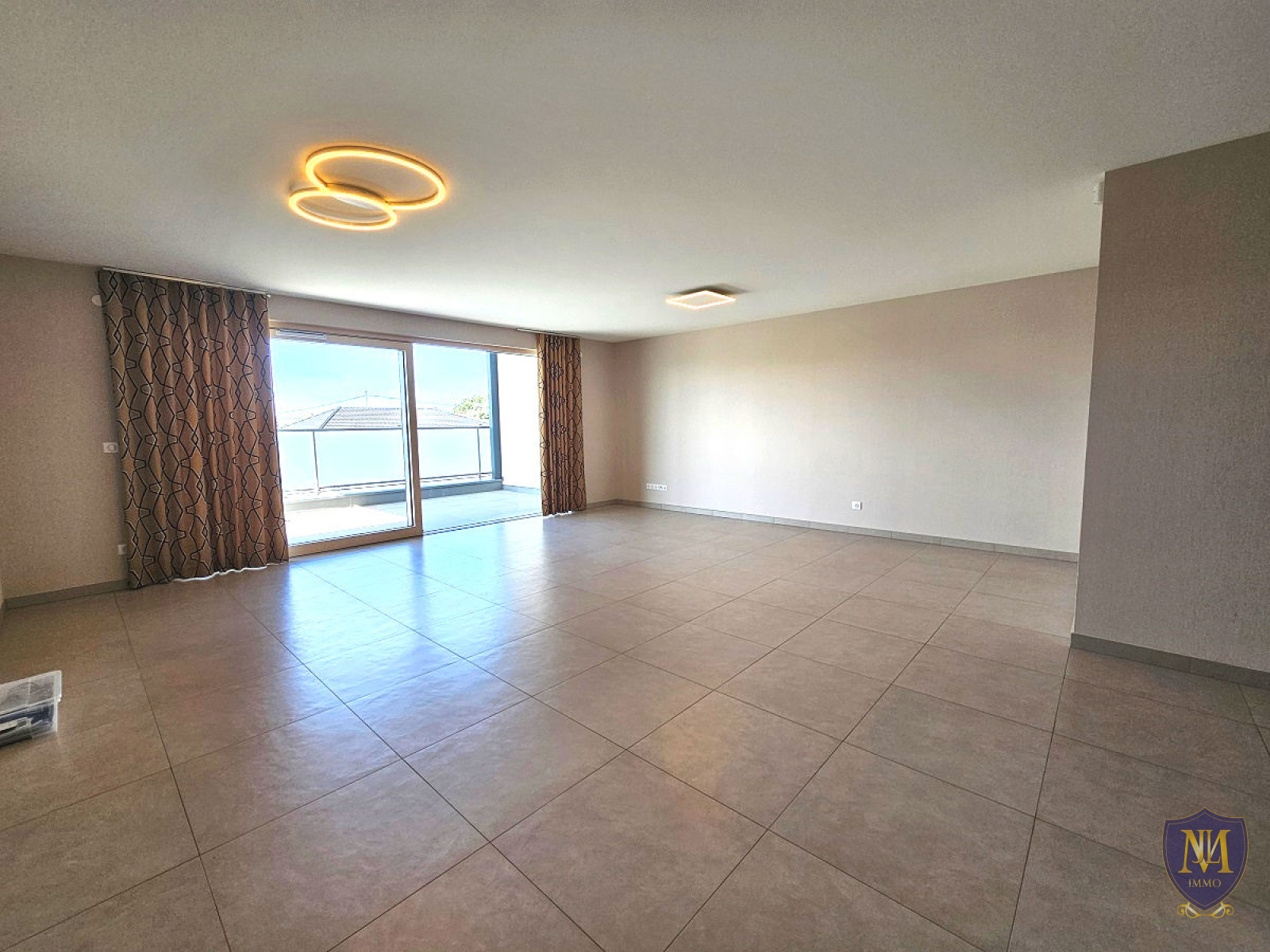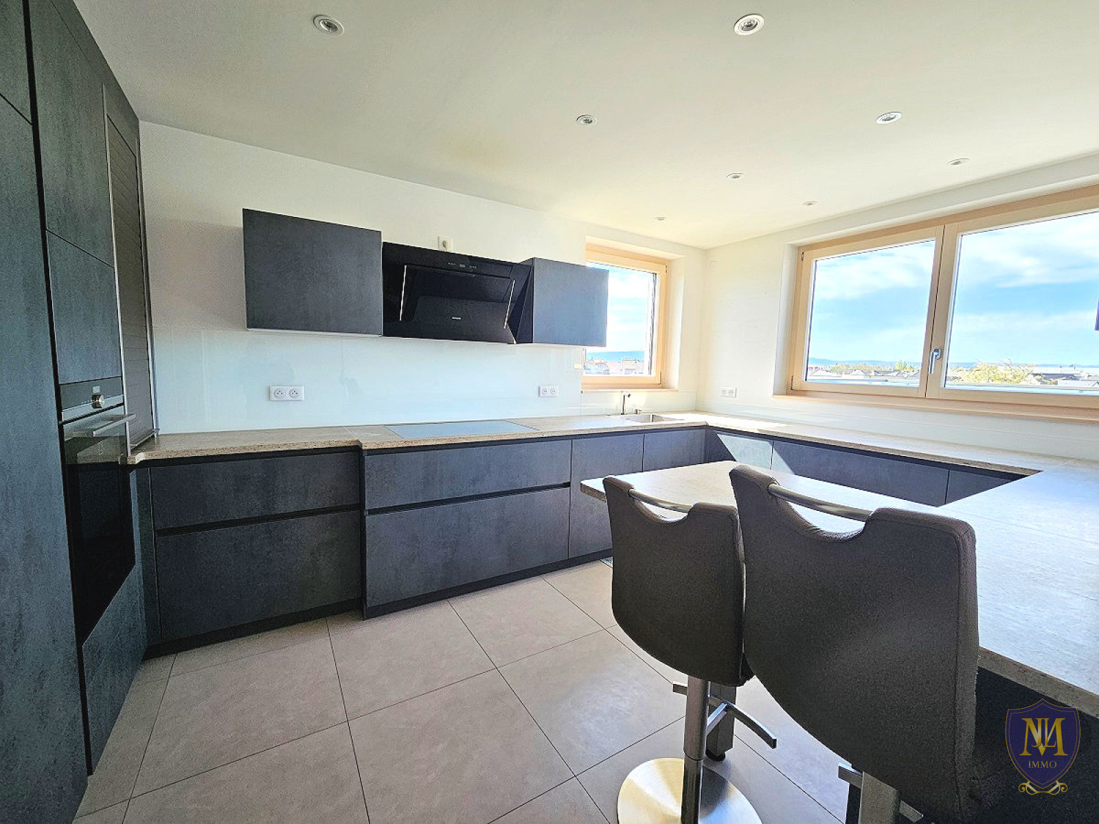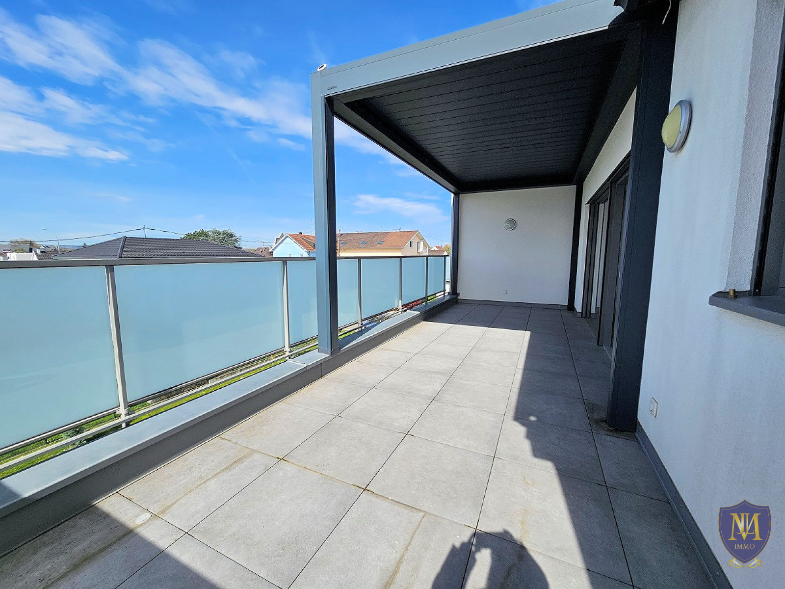Village-Neuf (68128)Situé au calme, dans une résidence de standing composée de 11 logements année 2017, au 2ème et dernier étage, très bel appartement 5 pièces aux prestations de qualité de 128,61 m² habitables, comprenant : une entrée, un lumineux salon séjour donnant sur une terrasse de 25,90 m² avec pergola bioclimatique, une cuisine équipée, un cellier, 3 chambres dont une avec armoire murale et une parentale donnant sur une 2ème terrasse de 25 m² avec dressing + salle d'eau équipée, une salle de bains équipée avec baignoire et douche, au sous-sol un double garage de 53 m² et à l'extérieur une place de parking. Disponible : 1er février 2024.