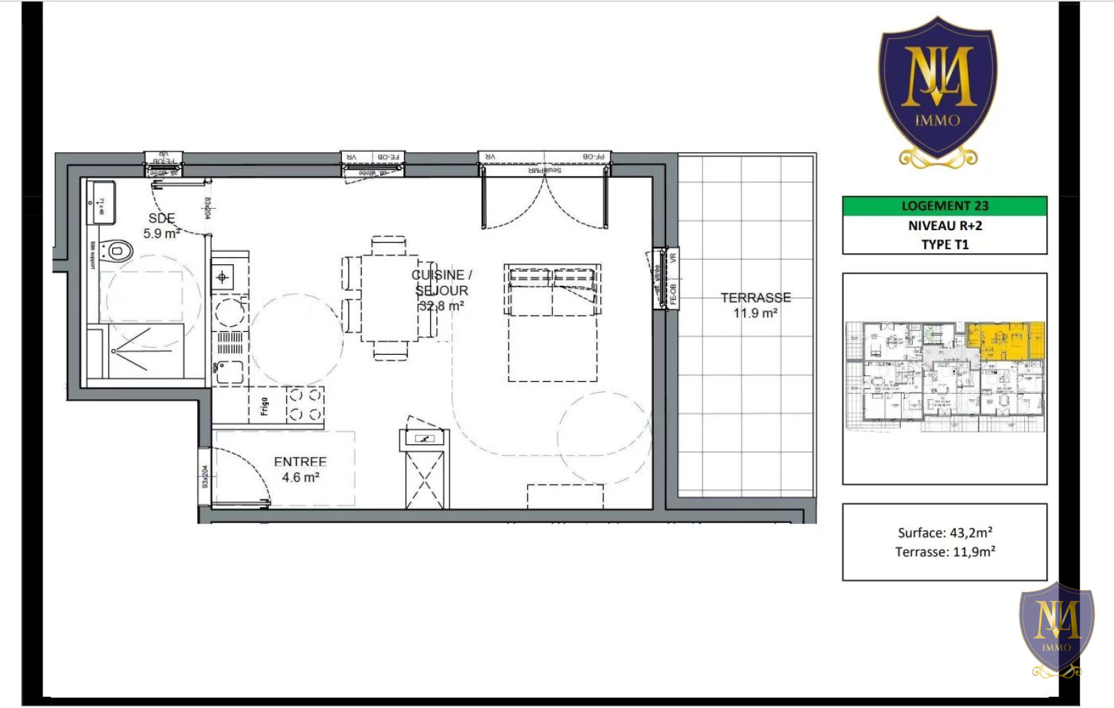 Belle résidence aux prestations de standing, proche de toutes commodités composée d'appartements allant du F1 au F5 et de locaux professionnels ! Plans disponible en agence. Appartement LOT 23 au 2ème étage, 1 pièce de 43,20 m² comprenant une entrée, une cuisine ouverte sur une pièce principale donnant sur une grande terrasse de 12 m² et une salle d'eau équipée. Garage et parking en option. Livraison prévue Septembre 2023 ! - ASCENSEUR - BELLE SITUATION - FRAIS DE NOTAIRE RÉDUITS Pour plus de renseignements ou pour un rendez-vous, contactez votre conseillère Muriel MEYER au 06 03 01 70 27 ou par mail : muriel.meyer@moebel-immo.com