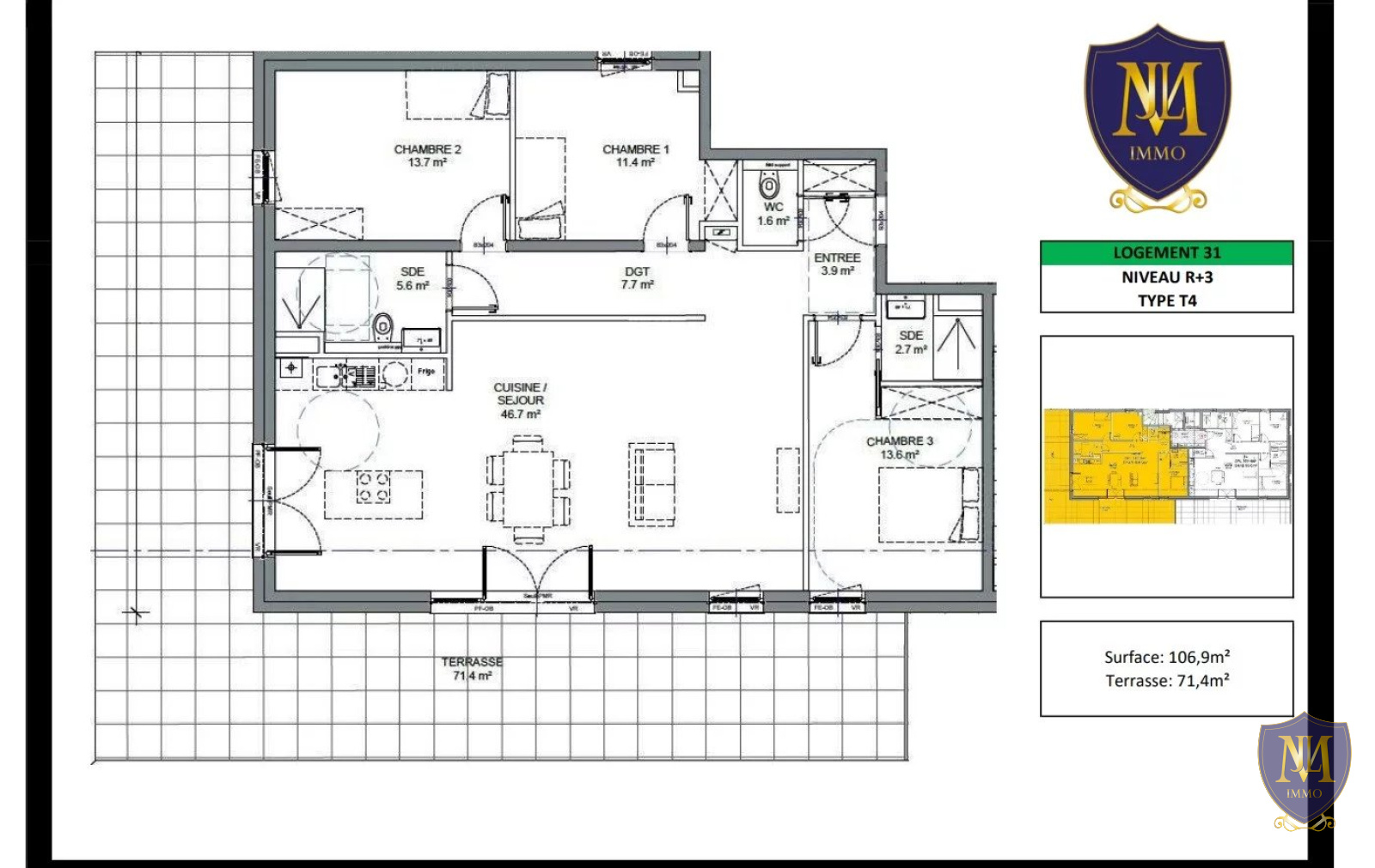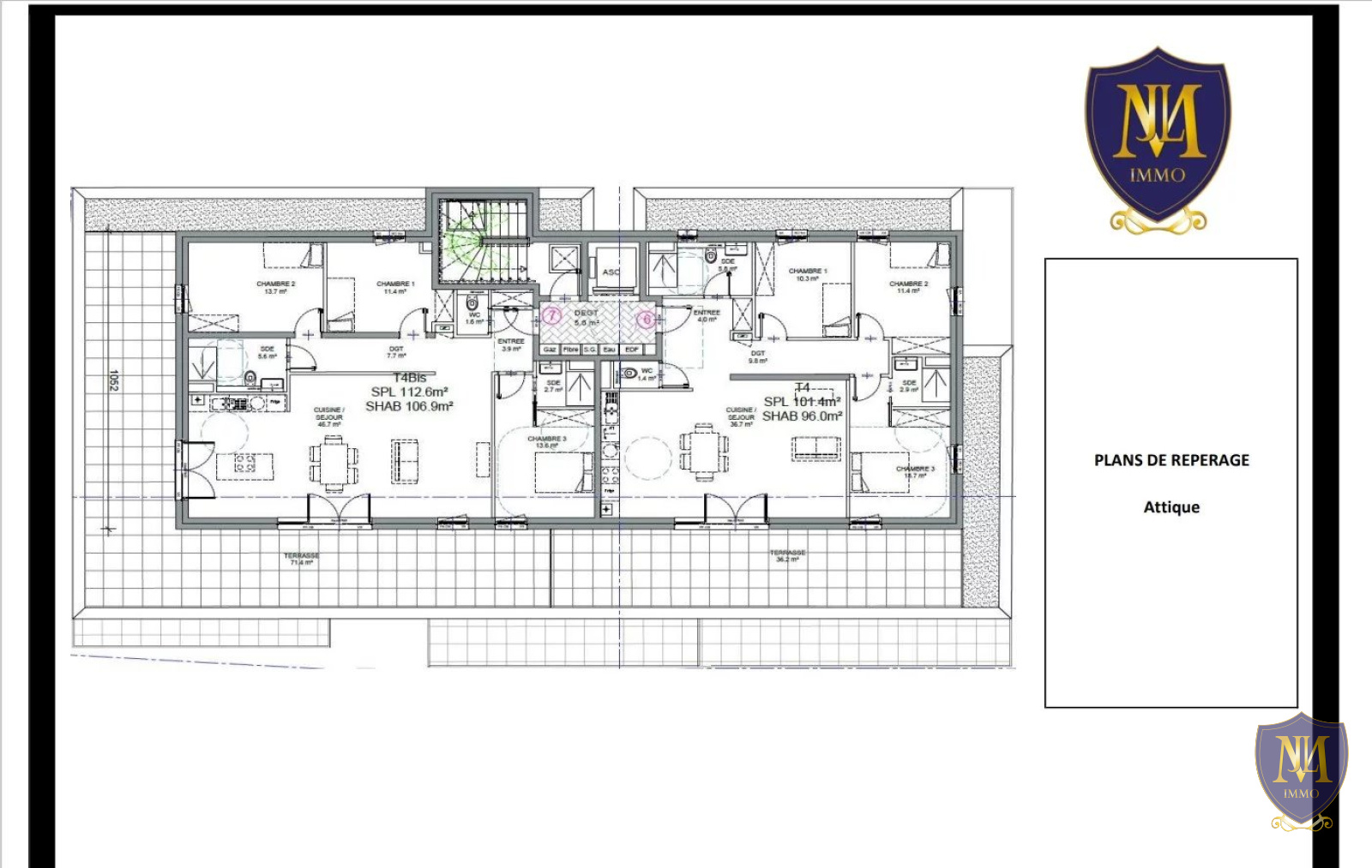 Belle résidence aux prestations de standing, proche de toutes commodités composée d'appartements allant du F1 au F5 et de locaux professionnels ! Plans disponibles en agence. Appartement LOT 31 en attique, 5 pièces de 106,90 m² comprenant une entrée, une cuisine ouverte sur un grand salon séjour donnant sur une magnifique terrasse de 71.40 m², 3 chambres dont une parentale avec salle d 'eau équipée et une salle d'eau équipée. Garage et parking en option. Livraison prévue Septembre 2023 ! - ASCENSEUR - BELLE SITUATION - FRAIS DE NOTAIRE RÉDUITS Pour plus de renseignements ou pour un rendez-vous, contactez votre conseillère Muriel MEYER au 06 03 01 70 27 ou par mail : muriel.meyer@moebel-immo.com