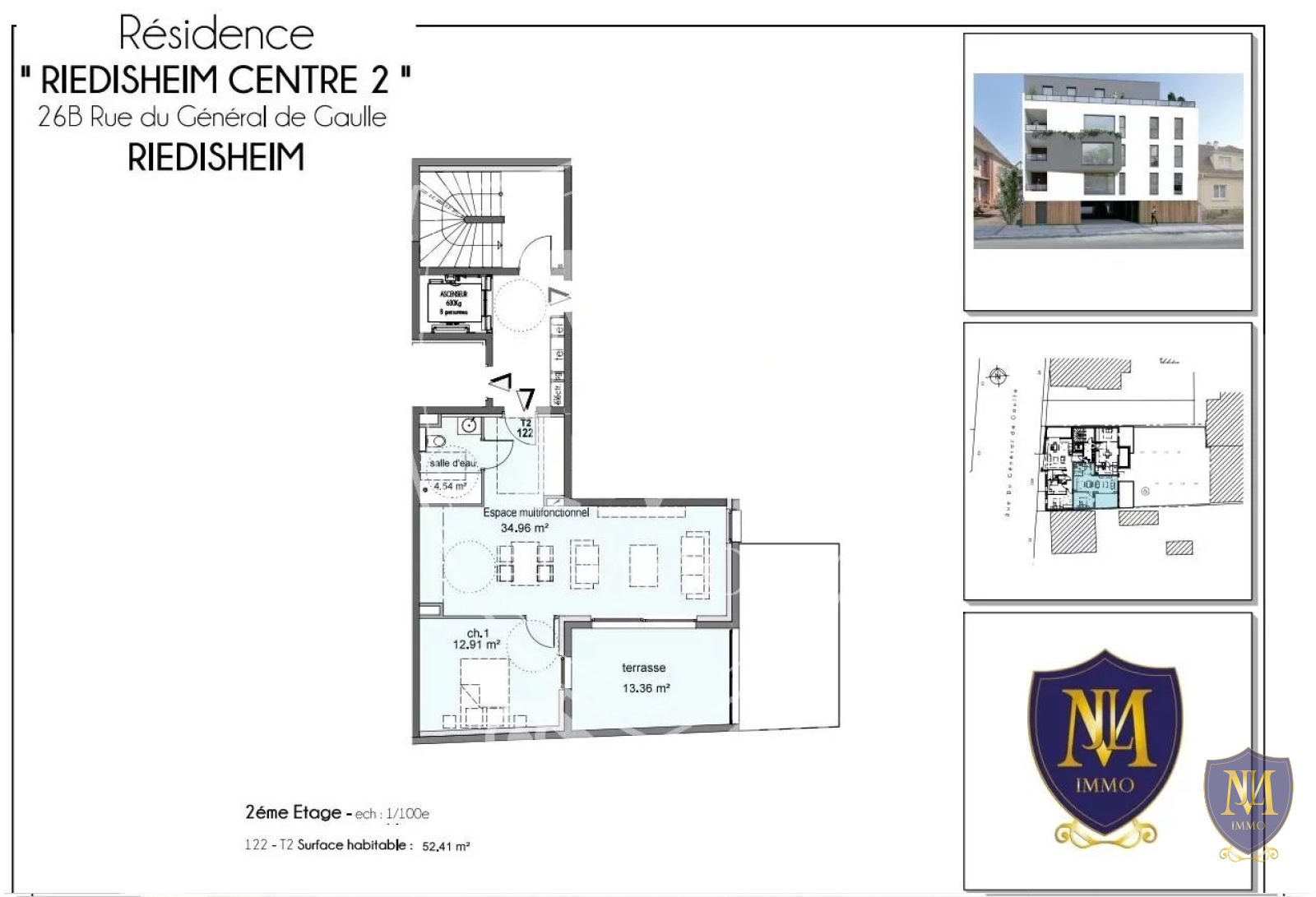 Riedisheim (68400)Petite résidence de 8 logements aux prestations de qualité allant F1 au F5, disponible sur plans dans notre agence ! Appartement LOT 122 au 2ème étage , 2 pièces de 51,51 m² comprenant : une entrée, une cuisine ouverte sur salon séjour, une terrasse, une chambre, une salle d'eau équipée, un WC séparé, un garage et une place de parking extérieur. -ASCENSEUR -FRAIS DE NOTAIRE RÉDUITS Pour plus de renseignements ou pour prendre rendez-vous, contactez votre conseiller Muriel MEYER au 06 03 01 70 27 ou par mail: muriel.meyer@moebel-immo.com