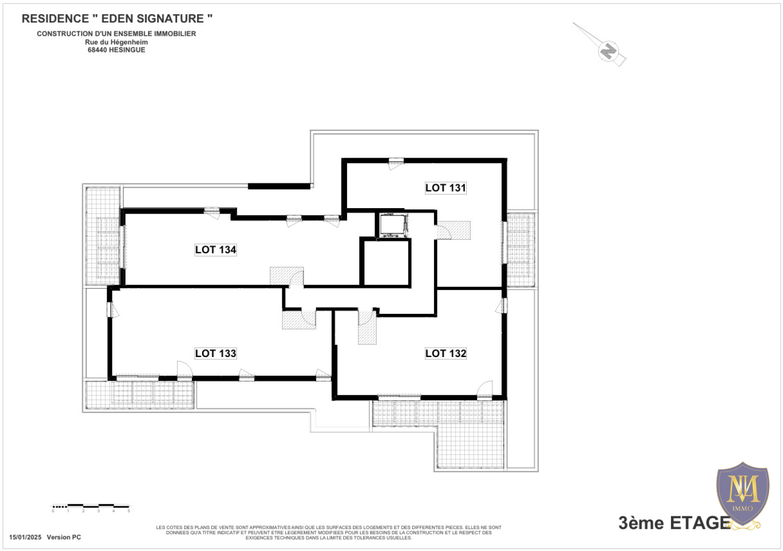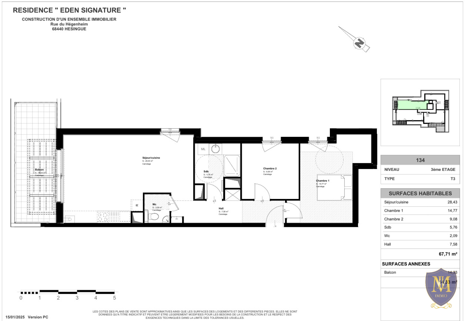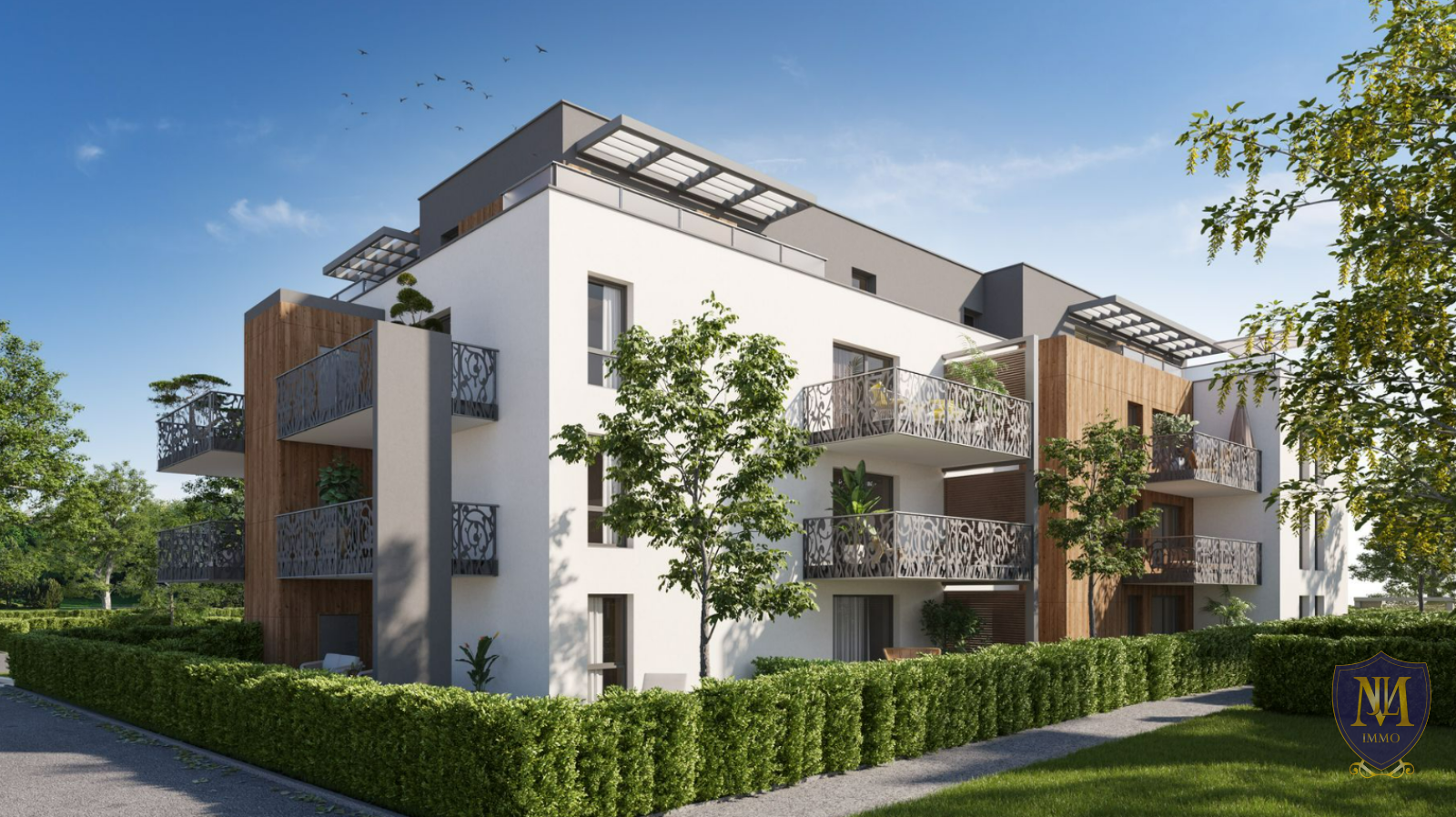 Hésingue (68220)Dans une résidence de standing proche de toutes commodités et de la frontière suisse, au troisième et dernier étage un appartement neuf de trois pièces de 67,71 m² habitables comprenant un hall d'entrée, deux chambres, une belle pièce de vie ouverte sur une cuisine de 28,43 m², une salle de bain équipée (douche ou baignoire au choix), un wc séparé, une belle terrasse de 14,33 m². Un garage et un parking peuvent compléter cette offre. Livraison prévue 2027.