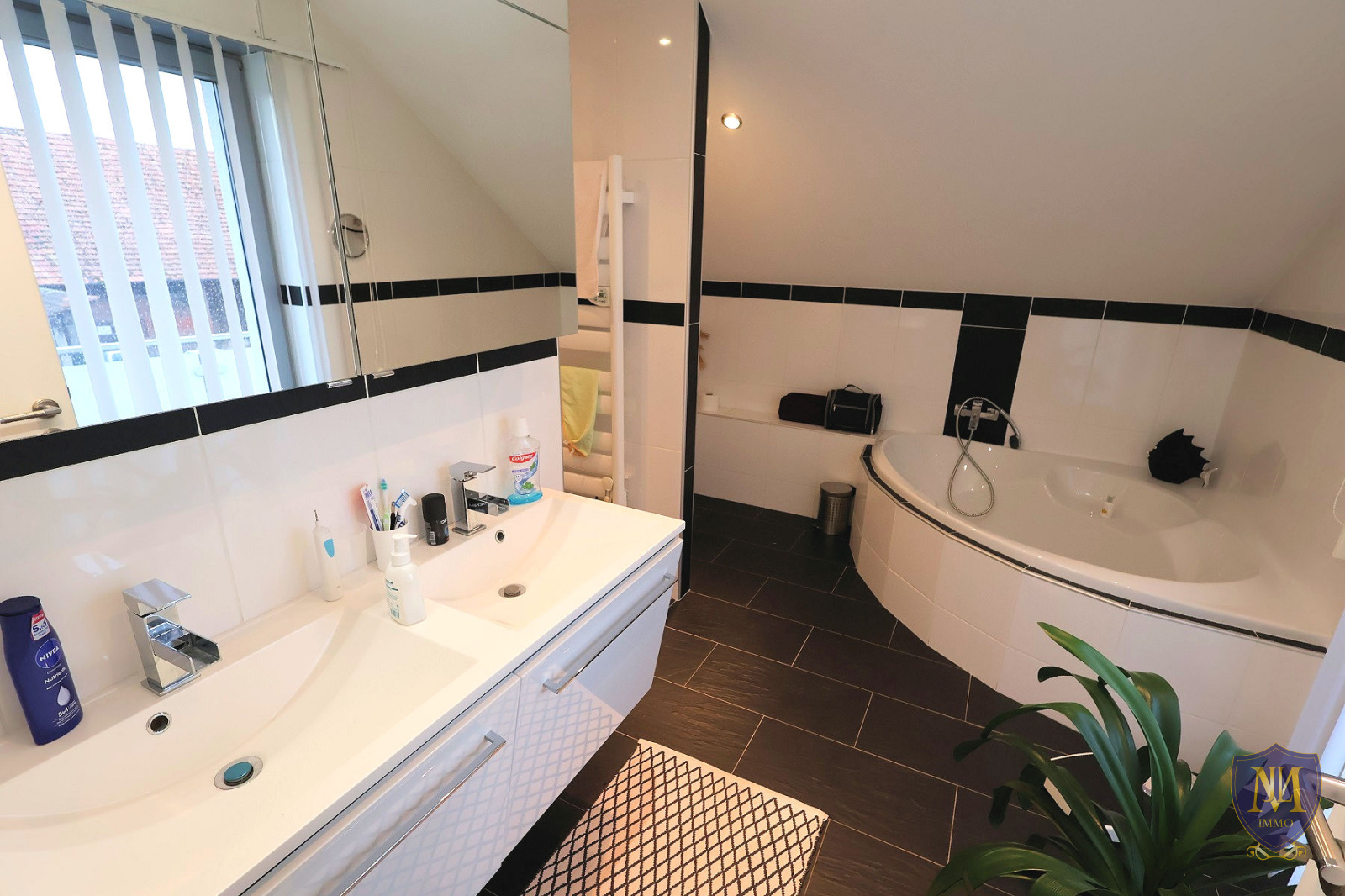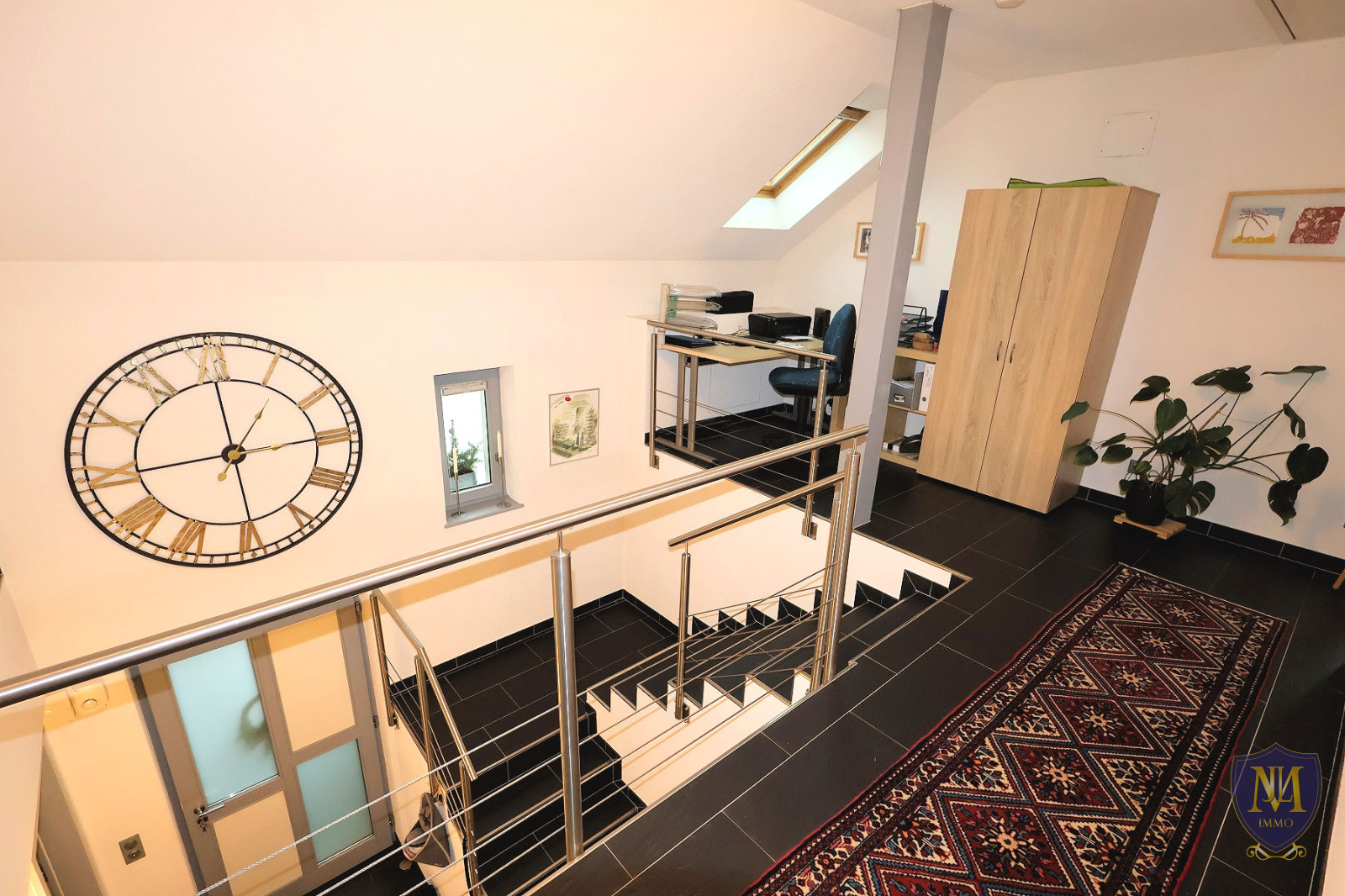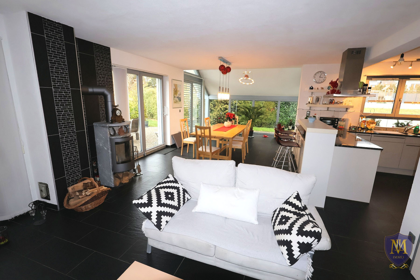 Neuwiller (68220)Dans un environnement calme à deux pas de la frontière Suisse, très belle maison d'architecte aux prestations de qualité année 2009 de 166 m², comprenant : une entrée avec vestiaire, une cuisine équipée ouverte sur un spacieux et lumineux salon séjour + poêle à bois donnant sur une terrasse, une chambre avec salle d'eau équipée + wc, une mezzanine avec coin home office, 2 chambres dont une avec dressing, une salle d'eau équipée + wc et une salle de bains équipée avec baignoire + douche. Le sous-sol se compose de 2 pièces multifonctions, une buanderie équipée d'une machine à laver et sèche-linge ainsi qu'une grande cave d'environ 35 m². À l'extérieur 5 places de parking dont 2 sous un carport. Le tout sur un terrain de 6 ares.