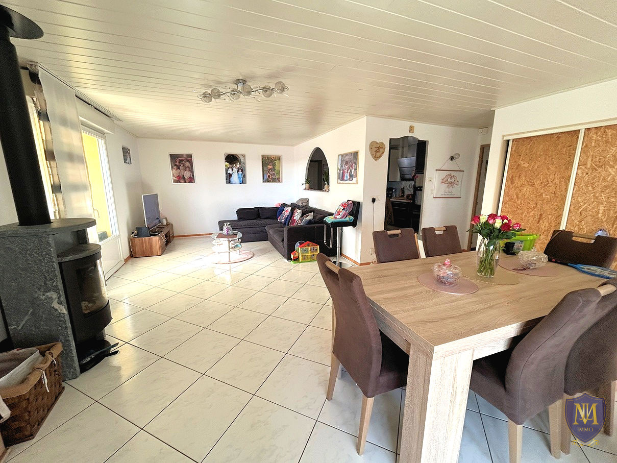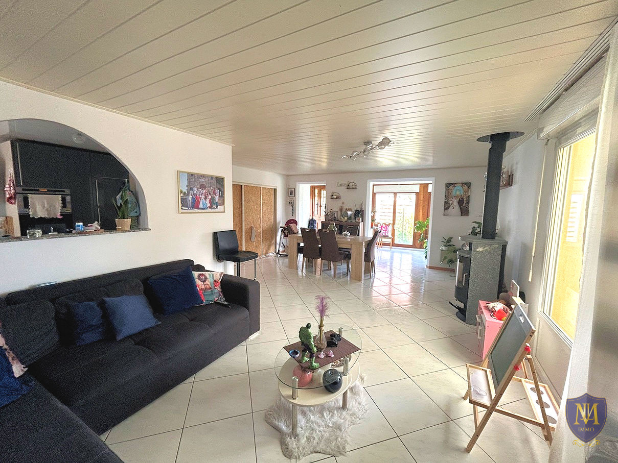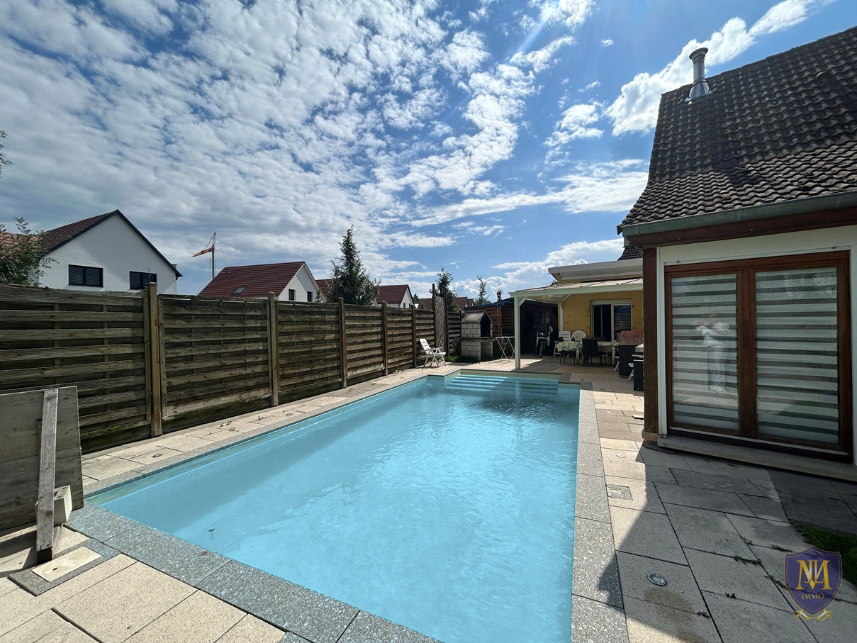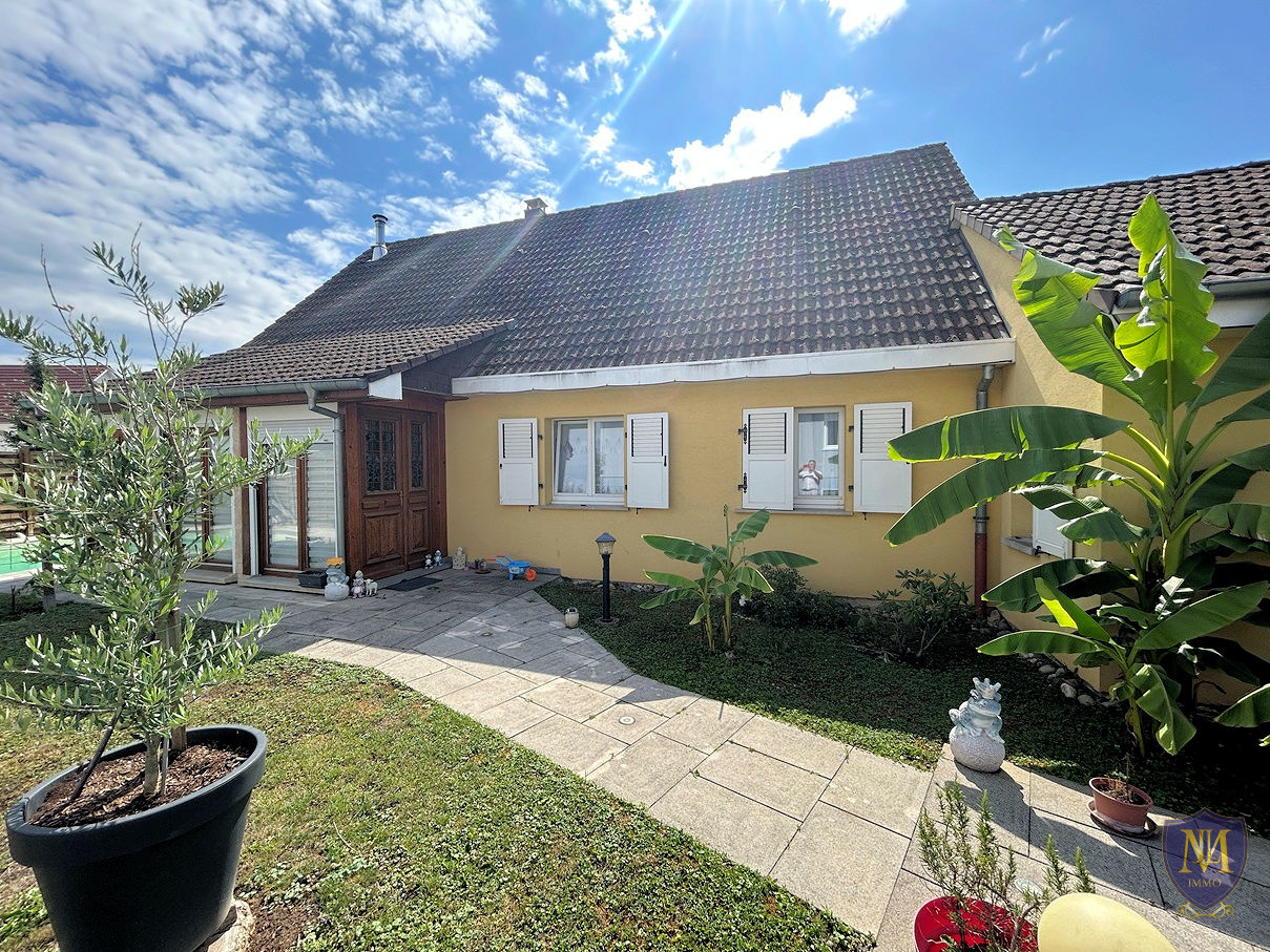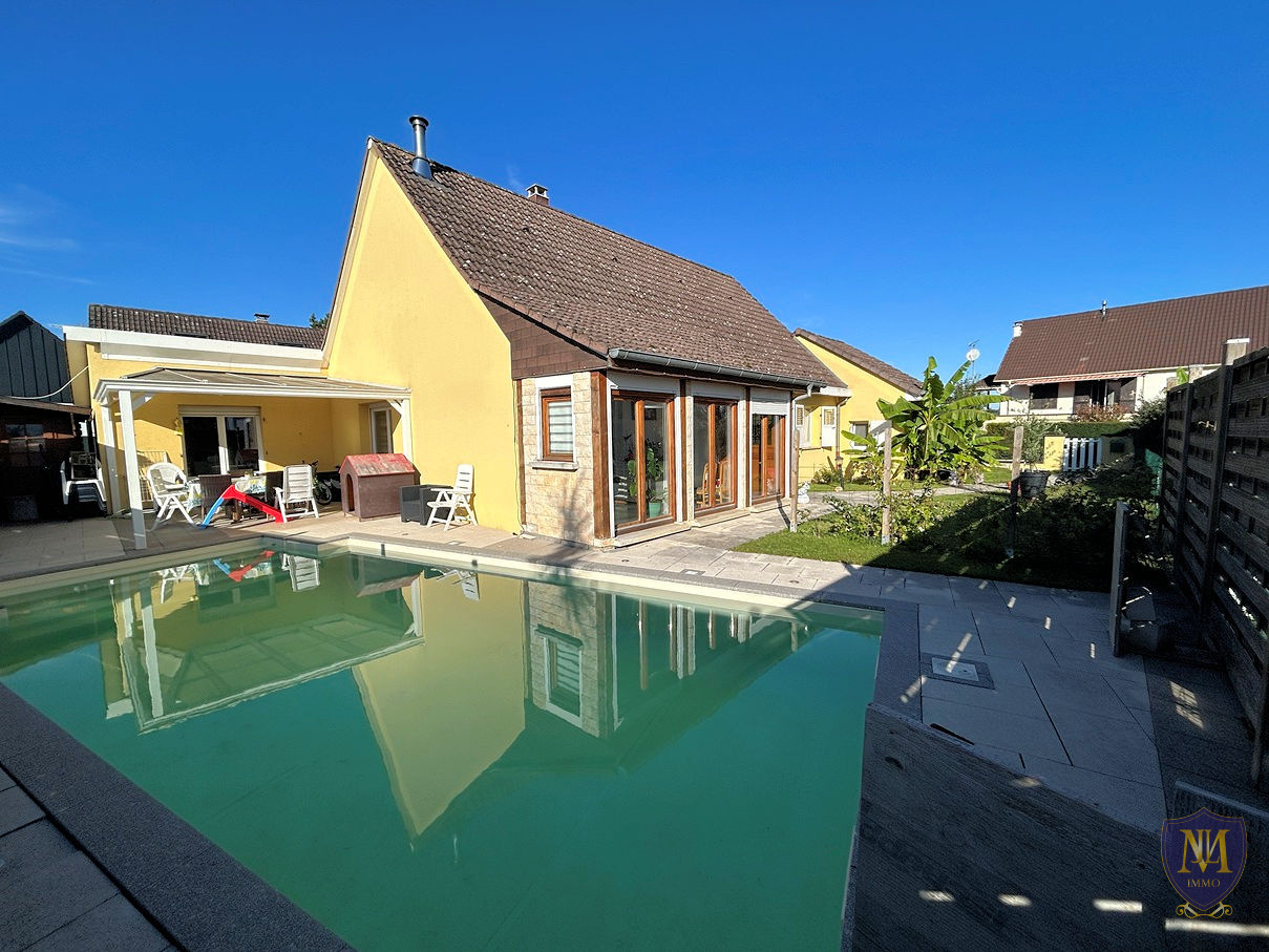Dietwiller (68440)Rare ! Très belle maison de plain-pied année 1984 rénovée au fil des années, comprenant : une cuisine équipée semi-ouverte sur un salon-séjour avec poêle à bois donnant accès à une grande terrasse avec pergola ainsi qu'à la piscine, 4 chambres dont une avec salle d'eau privative + wc, une mezzanine , une seconde salle d'eau, un wc séparé, une buanderie et un garage.