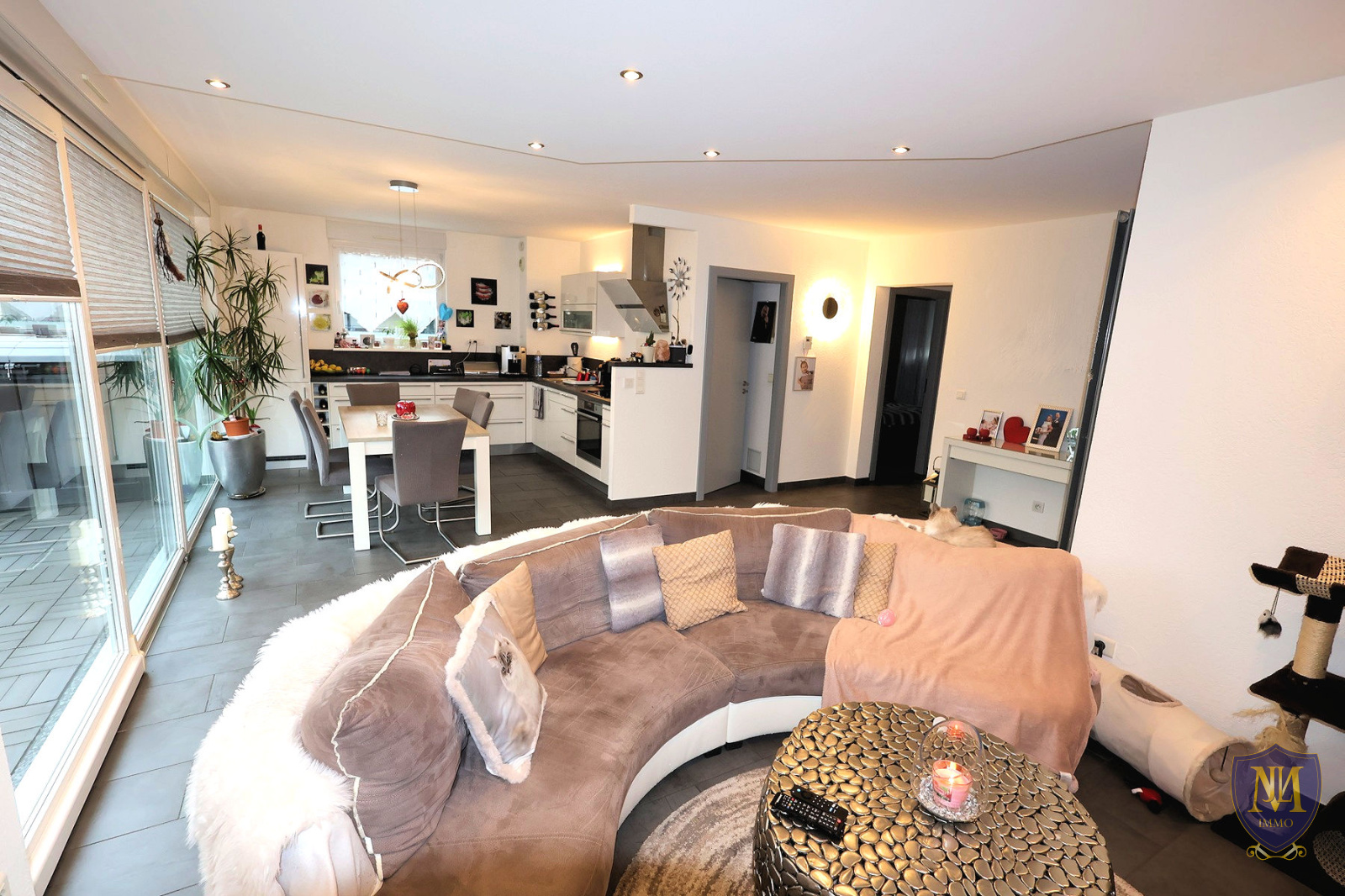Blotzheim (68730)Dans une petite copropriété de 4 logements, appartement 3 pièces année 2006 au 1er étage et dernier étage de 77,85 m², comprenant : une entrée, une cuisine équipée ouverte sur un salon séjour donnant sur une terrasse de 15 m², un cellier avec coin buanderie, 2 chambres, une salle d'eau équipée, un wc séparé et un double garage en enfilade au sous-sol. À l'extérieur 1 place de parking privé.