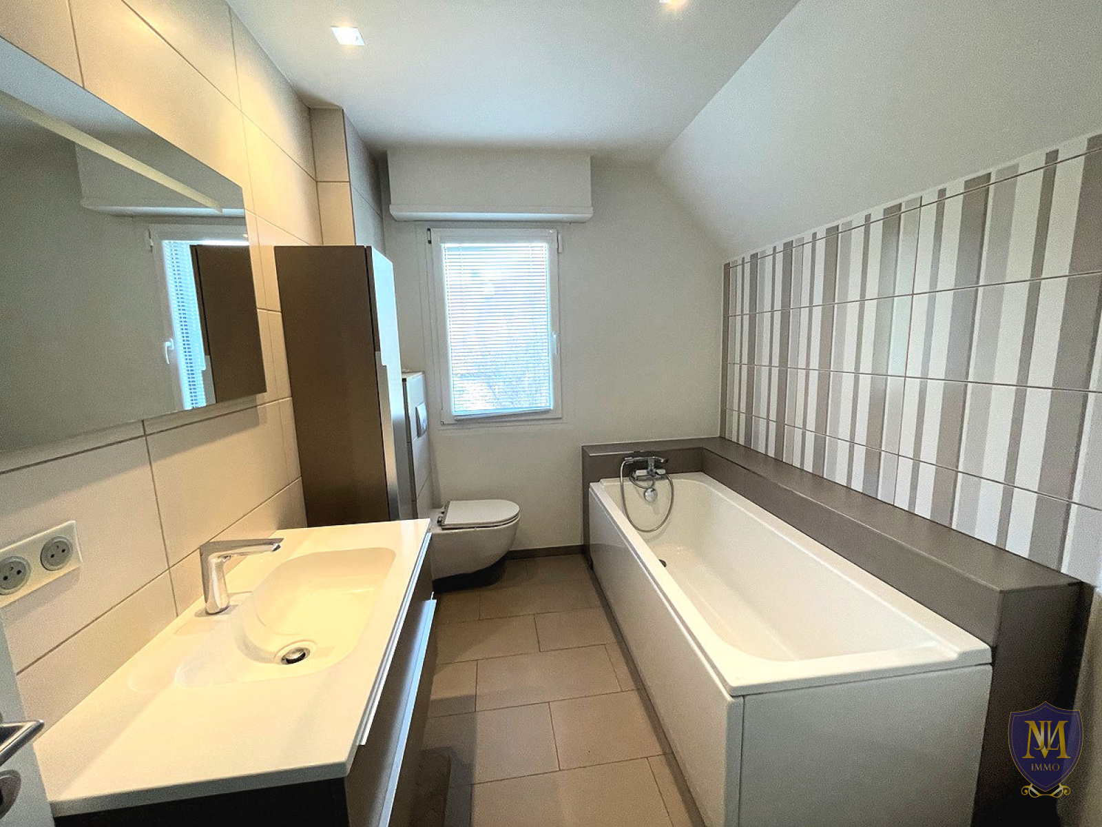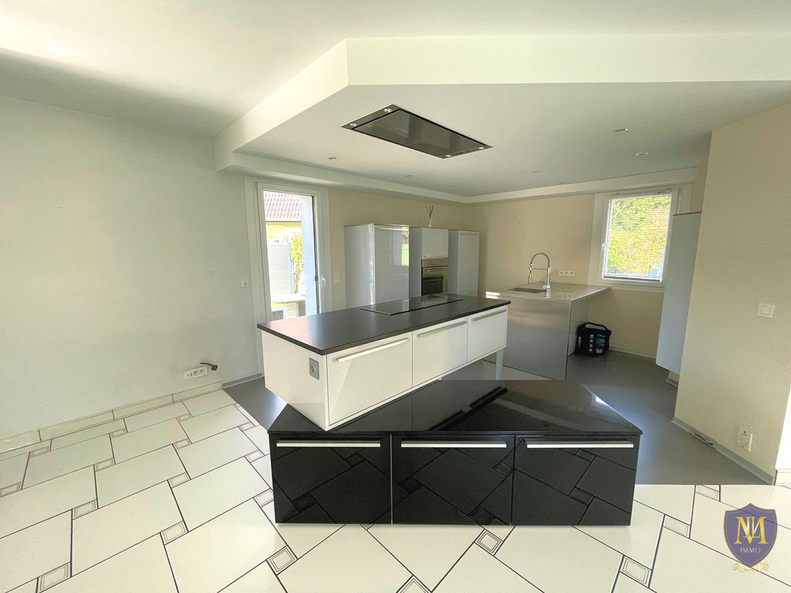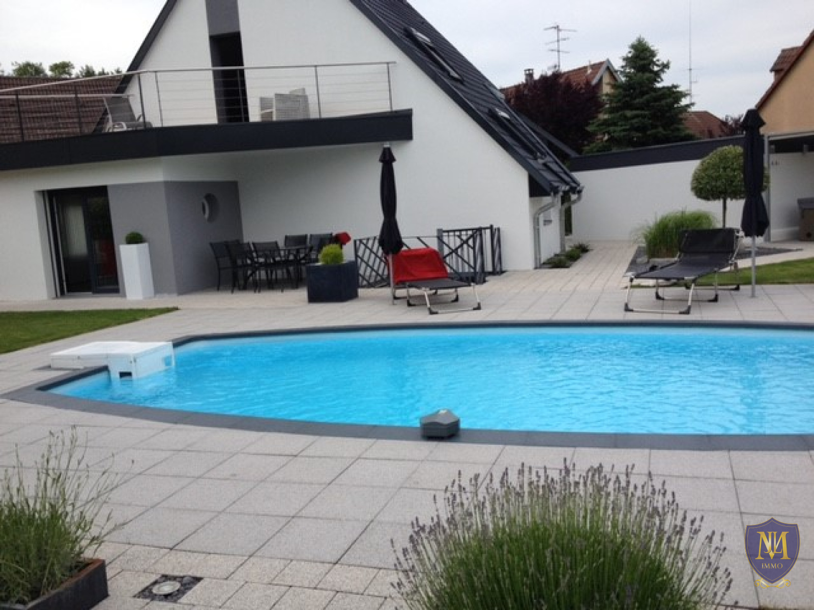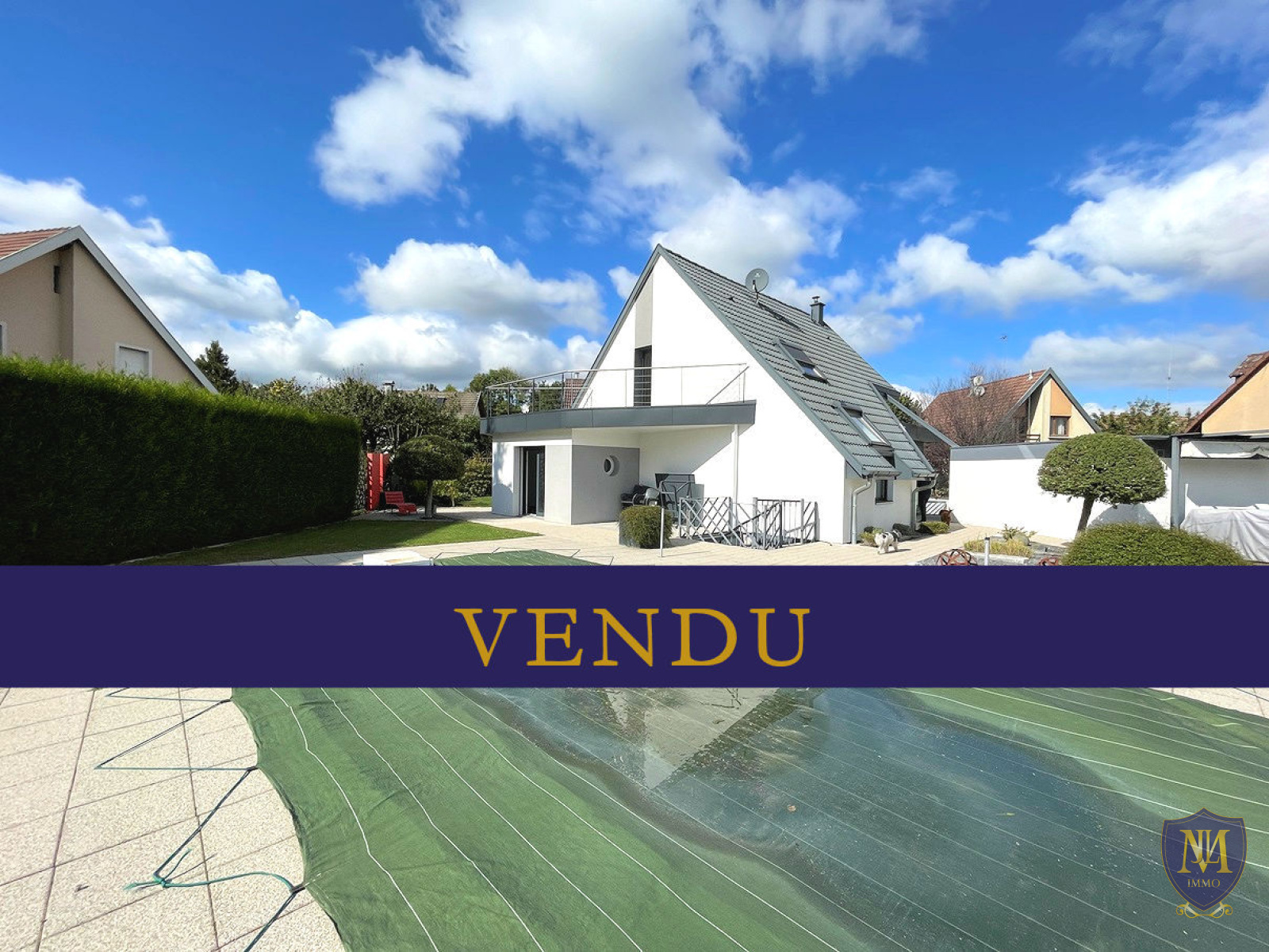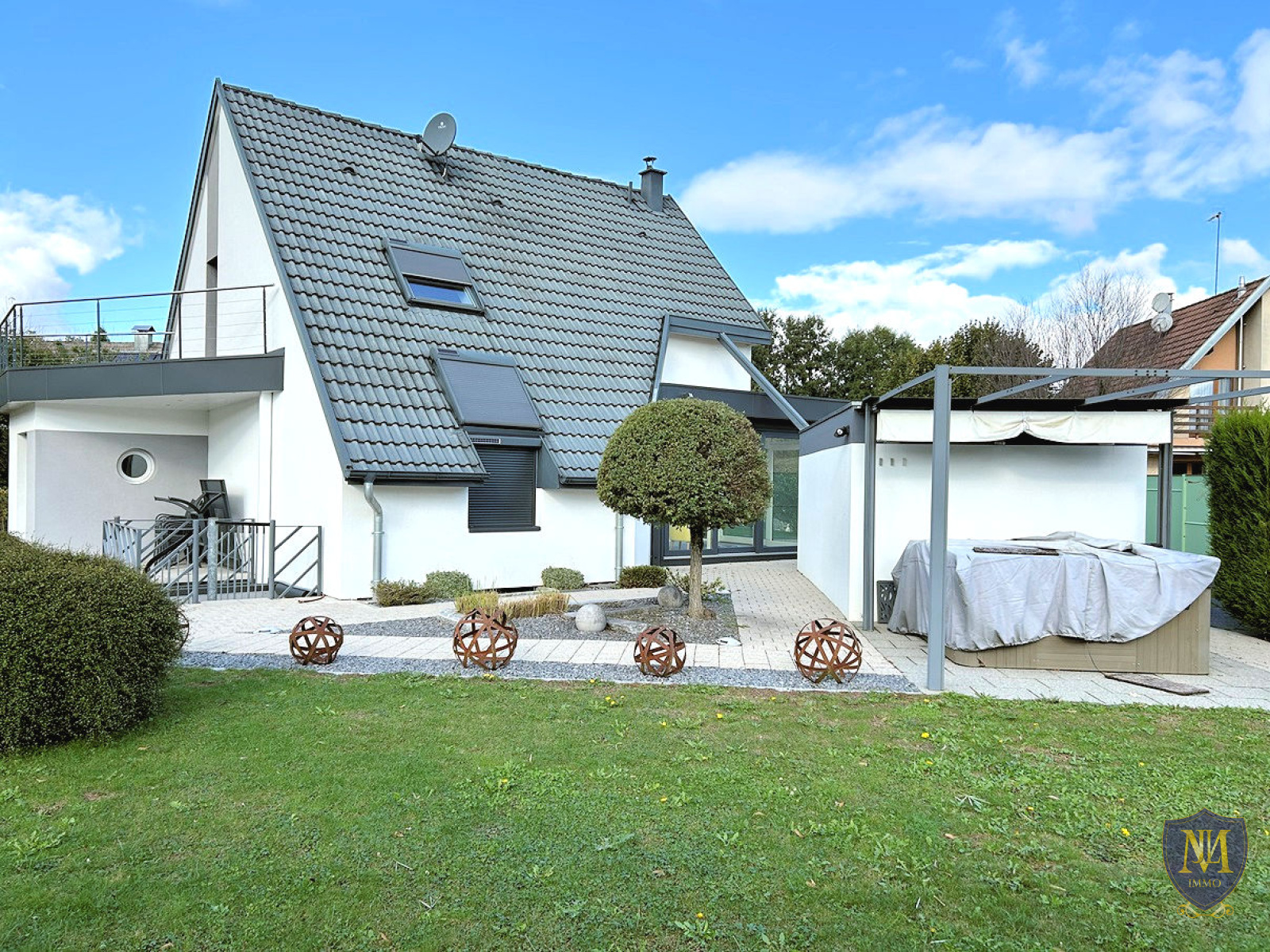 Blotzheim (68730)Située dans un quartier très prisé de Blotzheim, belle maison d'architecte année 1988 rénovée en 2014 de 116 m² habitables, comprenant : une entrée, une cuisine équipée ouverte sur un lumineux salon séjour donnant sur une terrasse, un wc séparé, une mezzanine pouvant faire office de chambre, 2 chambres dont une avec balcon, une salle de bains équipée + wc, un sous-sol aménagé avec une buanderie, une cave a vins, un sauna et une salle d'eau équipée. À l'extérieur, une 2ème terrasse, une piscine chauffée, un jacuzzi, un garage et 3 places de parking complètent ce bien. Le tout sur un terrain de 11,26 ares.