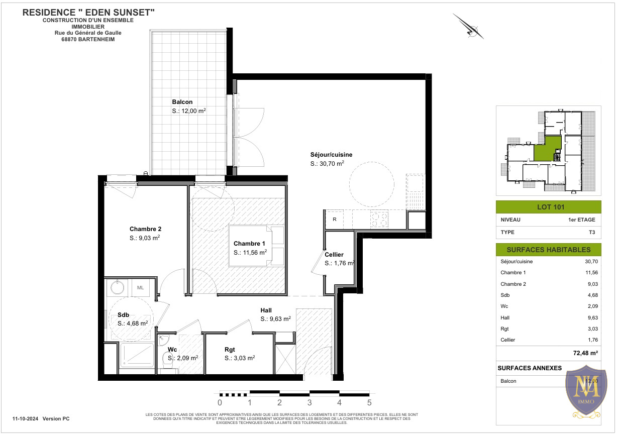 Bartenheim (68870)Très belle résidence de 18 logements aux prestations de standing, proche de toutes commodités. Lumineux appartement au premier étage, trois pièces de 72 m² comprenant un hall, une cuisine ouverte sur un salon séjour de 30 m² donnant sur une terrasse de 12 m², 2 chambres, salle de bain équipée (au choix, douche ou baignoire), un cellier. Garage et parking en option. Livraison prévue en 2027. - ENVIRONNEMENT VERDOYANT - PROCHE FRONTIERES SUISSE ET ALLEMANDE - PROCHE DES AXES AUTOROUTIERS ET DE L'AEROPORT - SERVICE ET COMMERCES DE PROXIMITE - FRAIS DE NOTAIRE RÉDUITS - GARANTIE DE PARFAIT ACHEVEMENT - APPARTEMENT ENTIEREMENT PERSONNALISABLE ET MODULABLE - ACCOMPAGNEMENT PERSONNALISE - NORMES RE2020 - FAIBLES CHARGES DE COPROPRIETE Pour plus de renseignements ou pour un rendez-vous, contactez votre conseillère Muriel MEYER au 06.03.01.70.27 ou par mail : muriel.meyer@moebel-immo.com