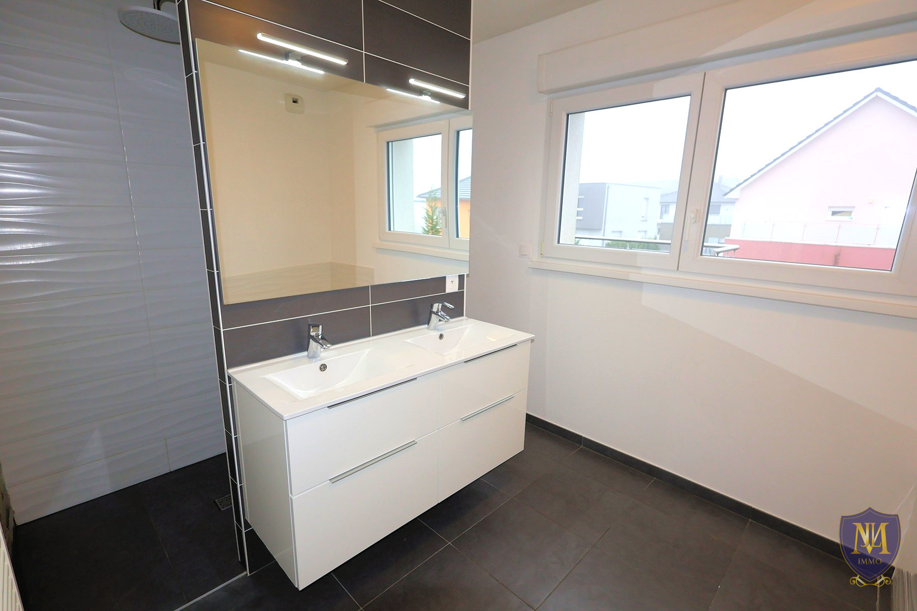 Saint-Louis (68300)Dans un environnement calme en lisière de forêt, belle maison contemporaine année 2016 de 135,40 m² habitables + 66 m² au sous-sol chauffé, comprenant : une entrée, une cuisine équipée ouverte sur un spacieux salon séjour donnant sur une terrasse avec pergola bioclimatique, un coin home office, un wc séparé et un double garage avec accès directement à la maison. À l'étage un grand dégagement donnant sur une terrasse, 3 chambres dont une avec dressing et une salle de bains équipée avec baignoire/douche + wc. Au sous-sol un local technique/buanderie ainsi qu'une grande pièce multifonctions et à l'extérieur un jardin + 3 places de parking viennent compléter ce bien. Le tout sur un terrain de 8,80 ares.