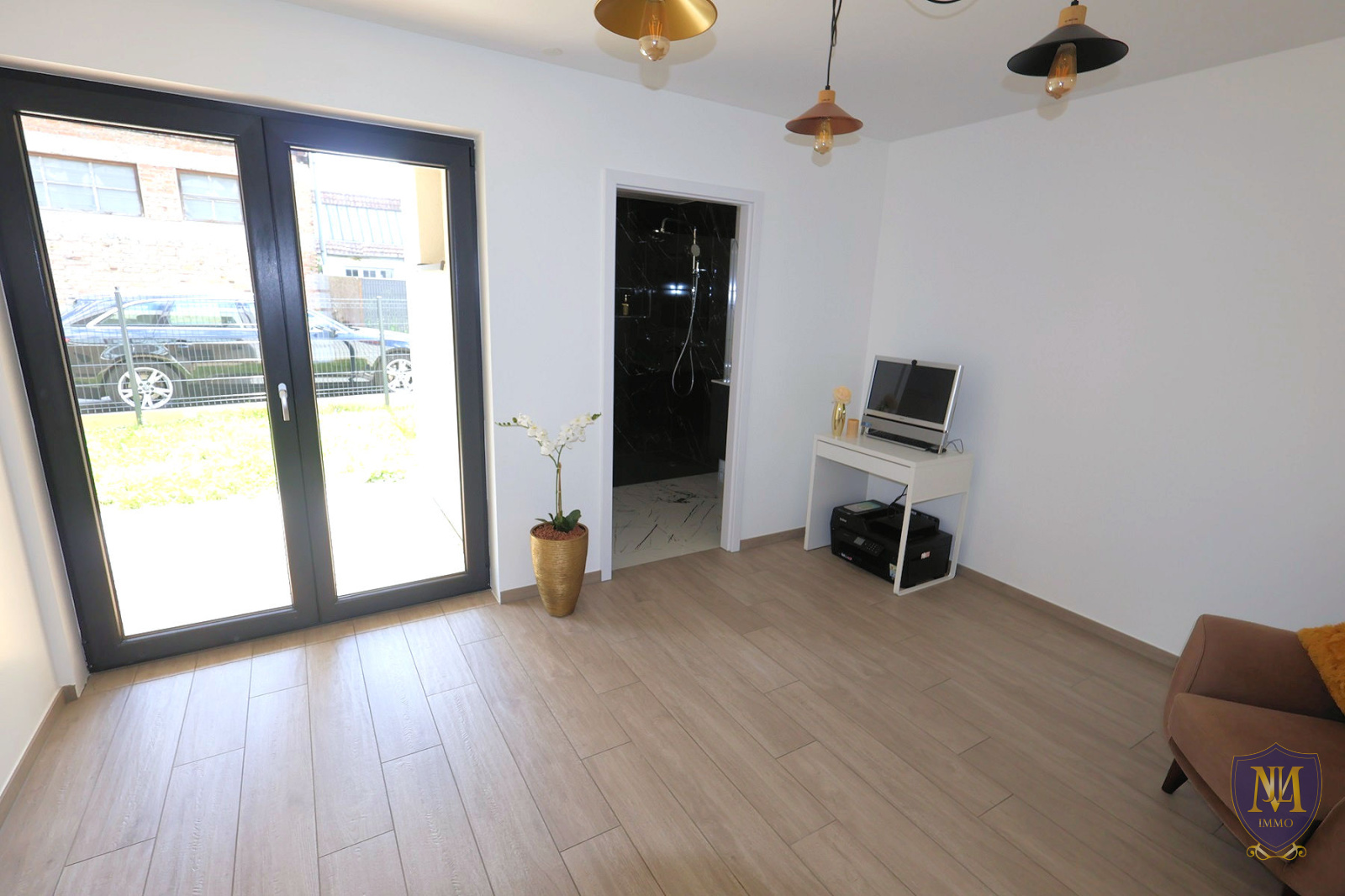 Au rez-de-chaussée : une entrée, un local technique, un cellier, un bureau/chambre également accessible à la terrasse + jardinet et une salle d'eau équipée;